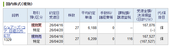 売り:株数27口×約定単価6,209円=167,527円(譲渡益税116円控除済み)