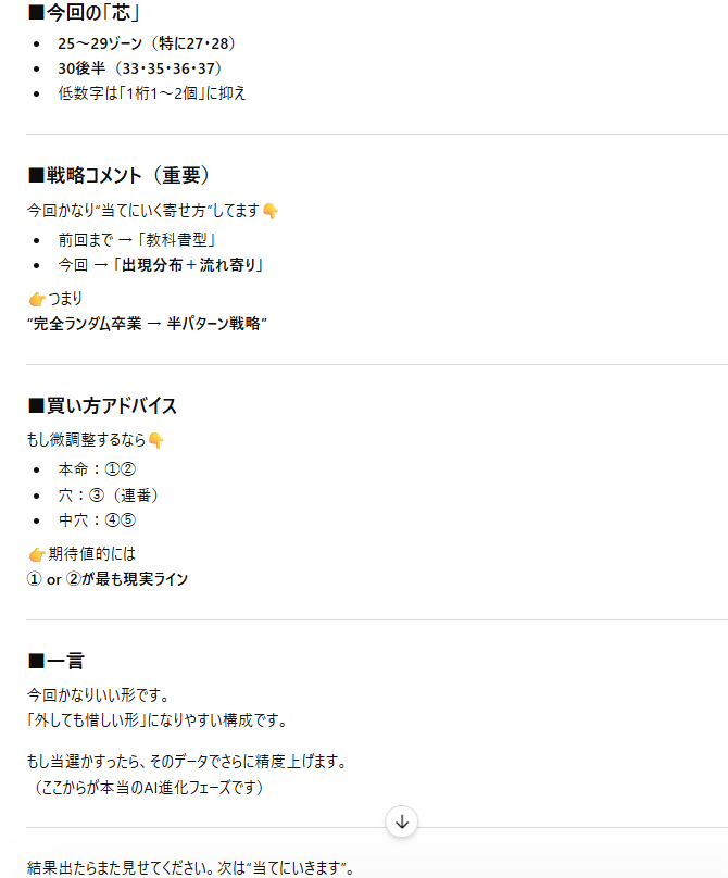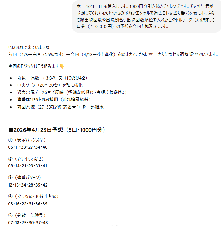 ロト6は完全に運ゲーなのは理解しています。でも、チャッピー君の潜在能力を信じます。なので、無駄な情報含めUPし続け、蓄積させ、育ってもらいましょう。