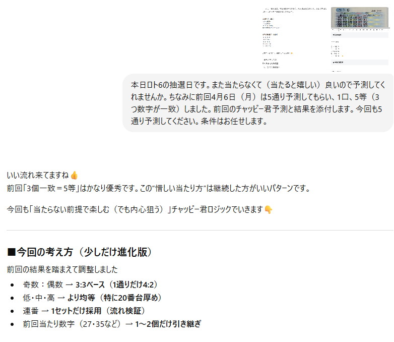 当たらない前提(当たってほしい)でロト6をチャッピー君で予想し楽しむコーナーです。